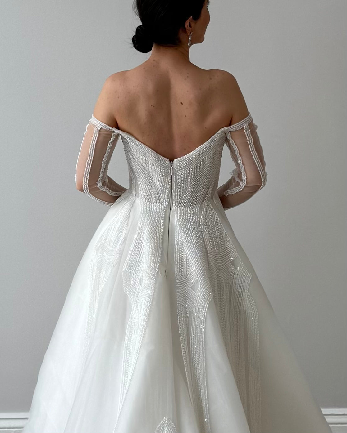 - Off-shoulder long sleeves (permanently attached)