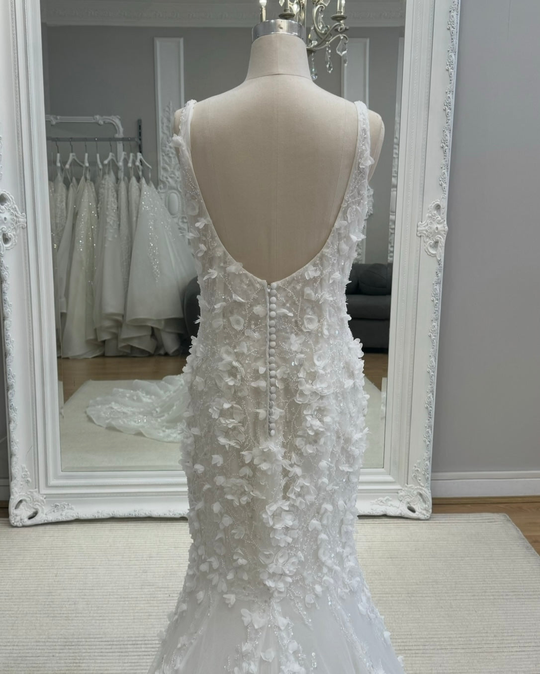 Sample gowns consist of new and pre-existing floor samples, most of which have been tried on but never worn to a wedding. These gowns may require repairs, alterations, and/or dry cleaning, which are not included in the price. Due to their nature, sample gown measurements may vary slightly from the original size grading due to stretching from try-ons. By making a purchase, you acknowledge and accept the condition of the sample gown as described and agree that all sales are final.