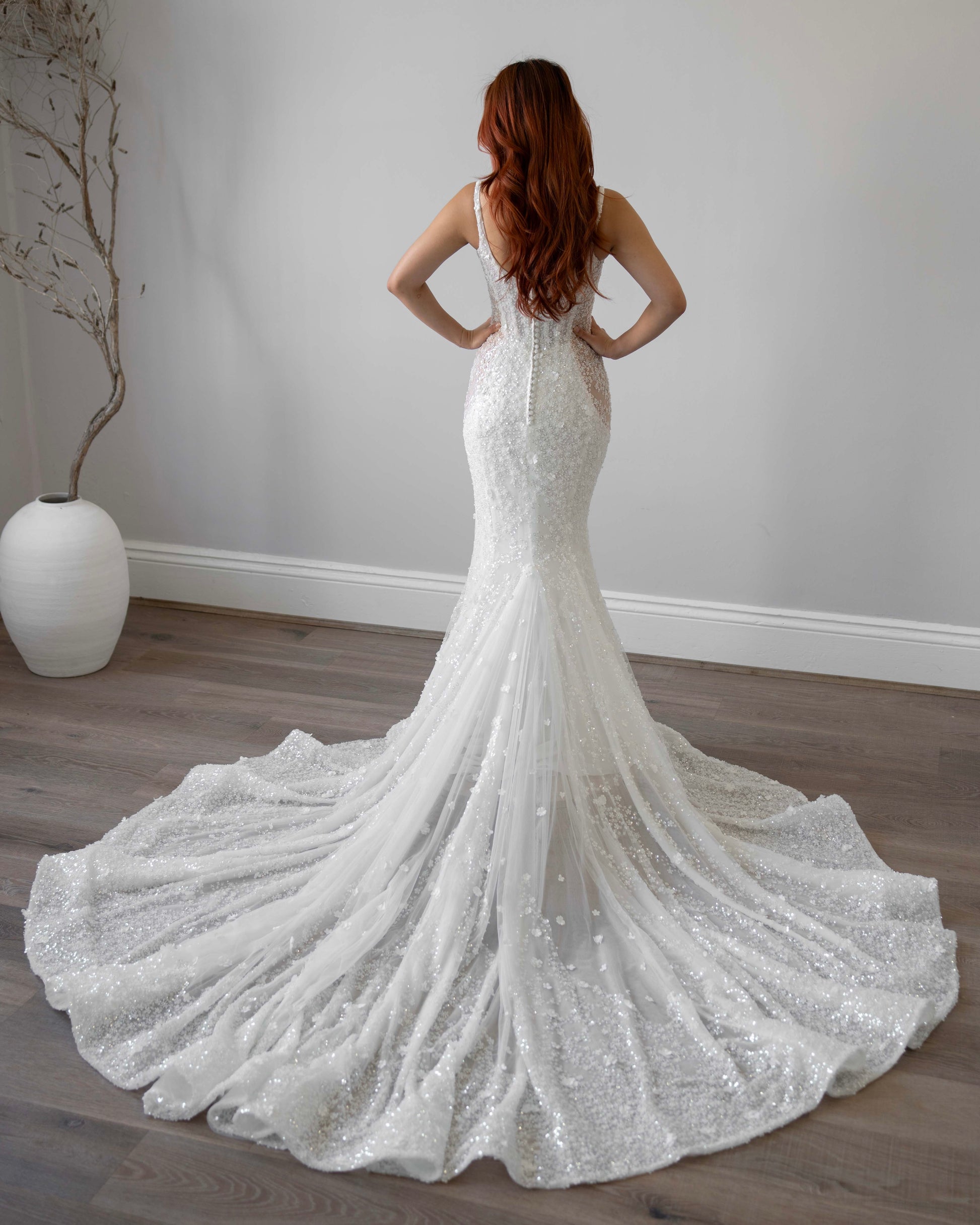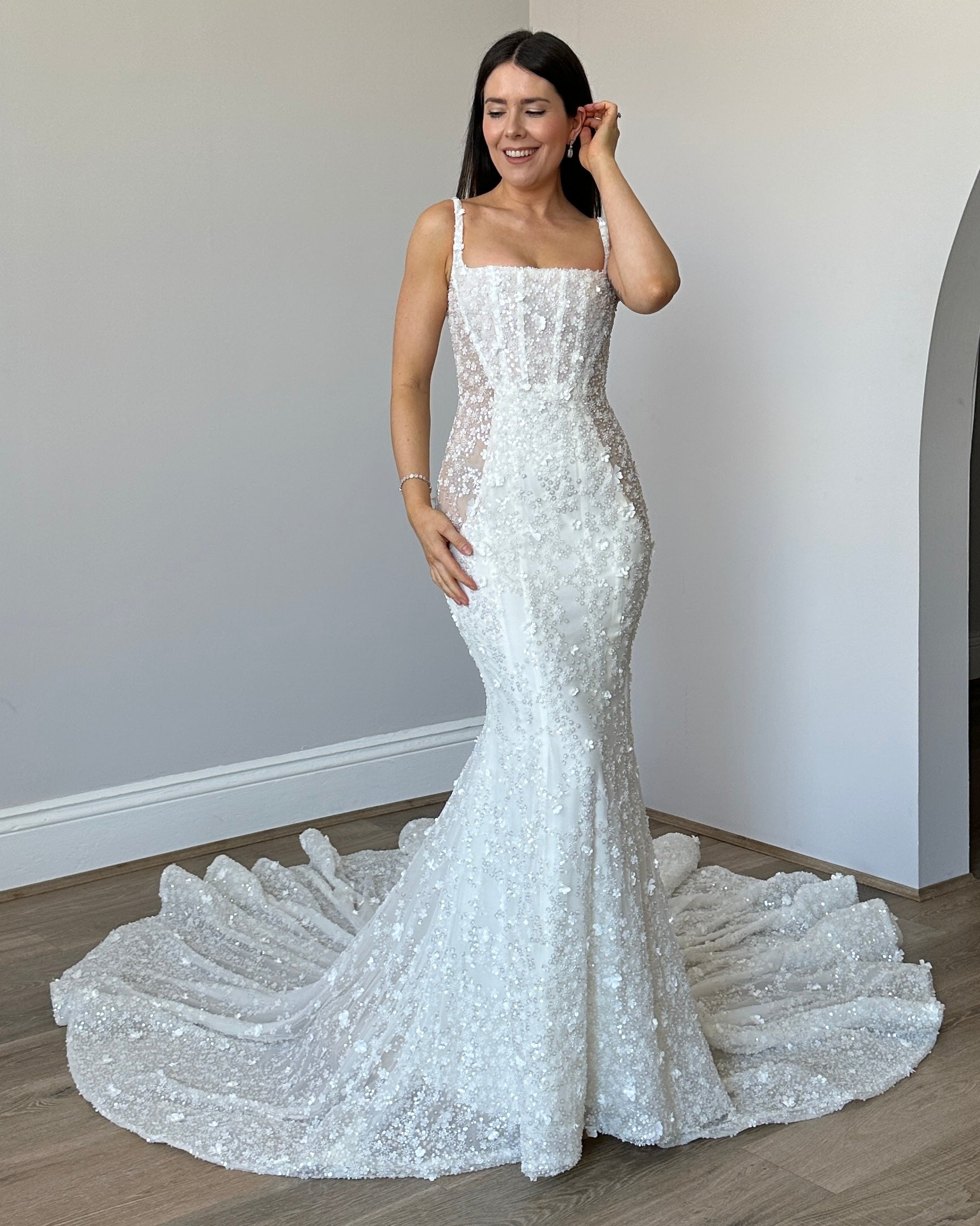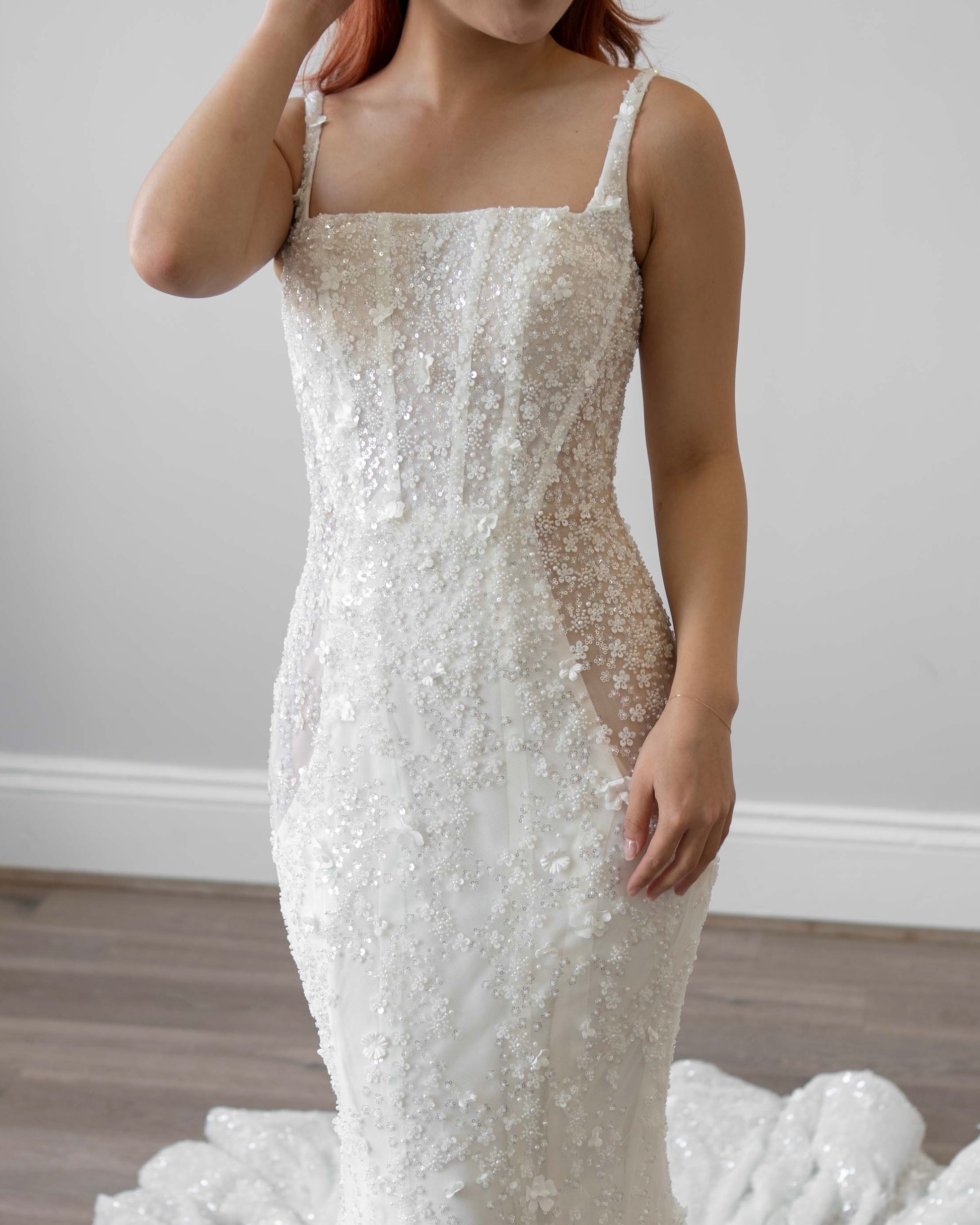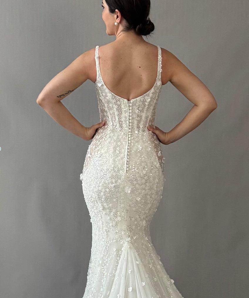 Sample gowns consist of new and pre-existing floor samples, most of which have been tried on but never worn to a wedding. These gowns may require repairs, alterations, and/or dry cleaning, which are not included in the price. Due to their nature, sample gown measurements may vary slightly from the original size grading due to stretching from try-ons. By making a purchase, you acknowledge and accept the condition of the sample gown as described and agree that all sales are final.