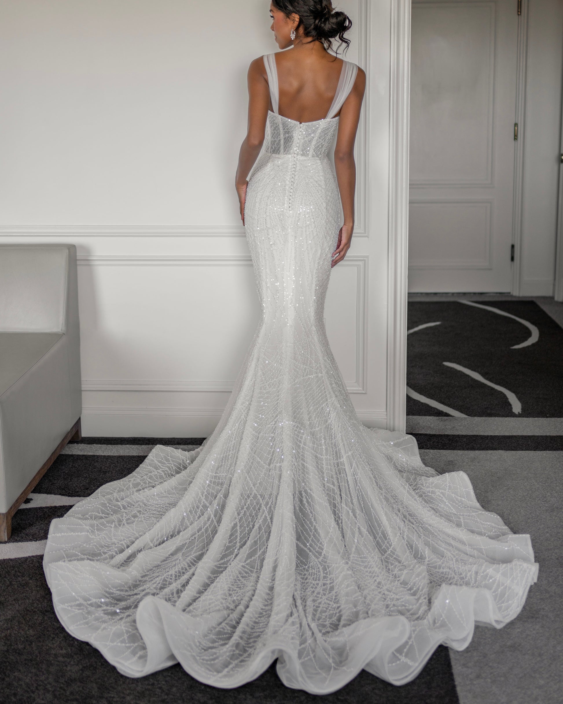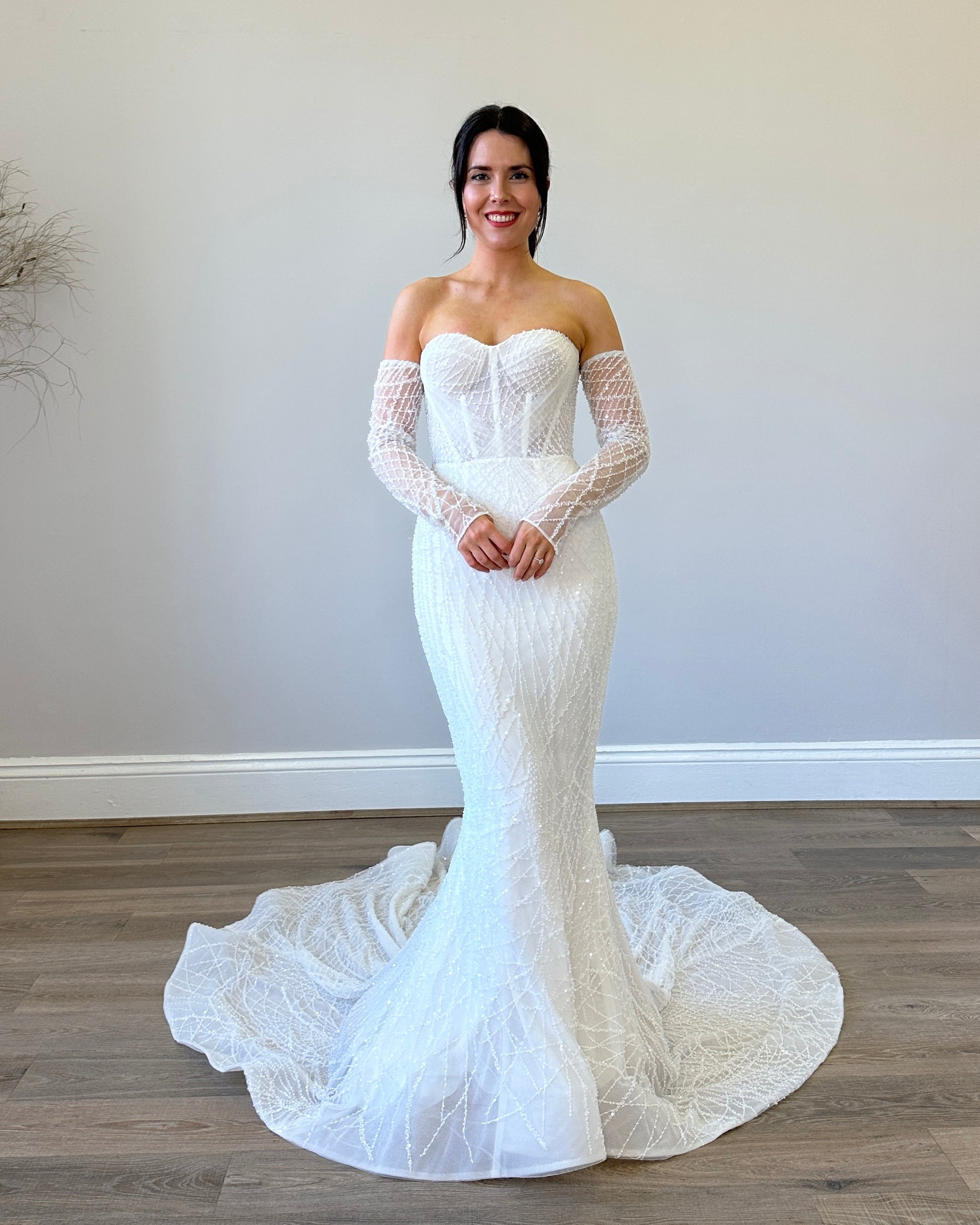 Sample gowns consist of new and pre-existing floor samples, most of which have been tried on but never worn to a wedding. These gowns may require repairs, alterations, and/or dry cleaning, which are not included in the price. Due to their nature, sample gown measurements may vary slightly from the original size grading due to stretching from try-ons. By making a purchase, you acknowledge and accept the condition of the sample gown as described and agree that all sales are final.