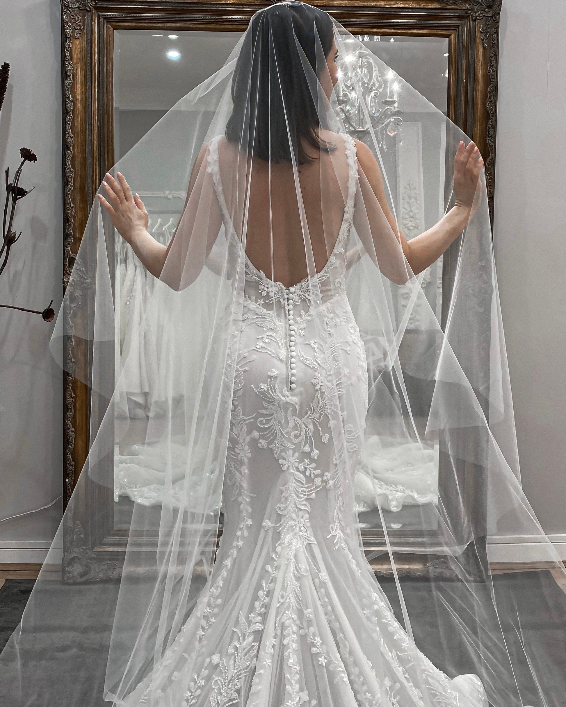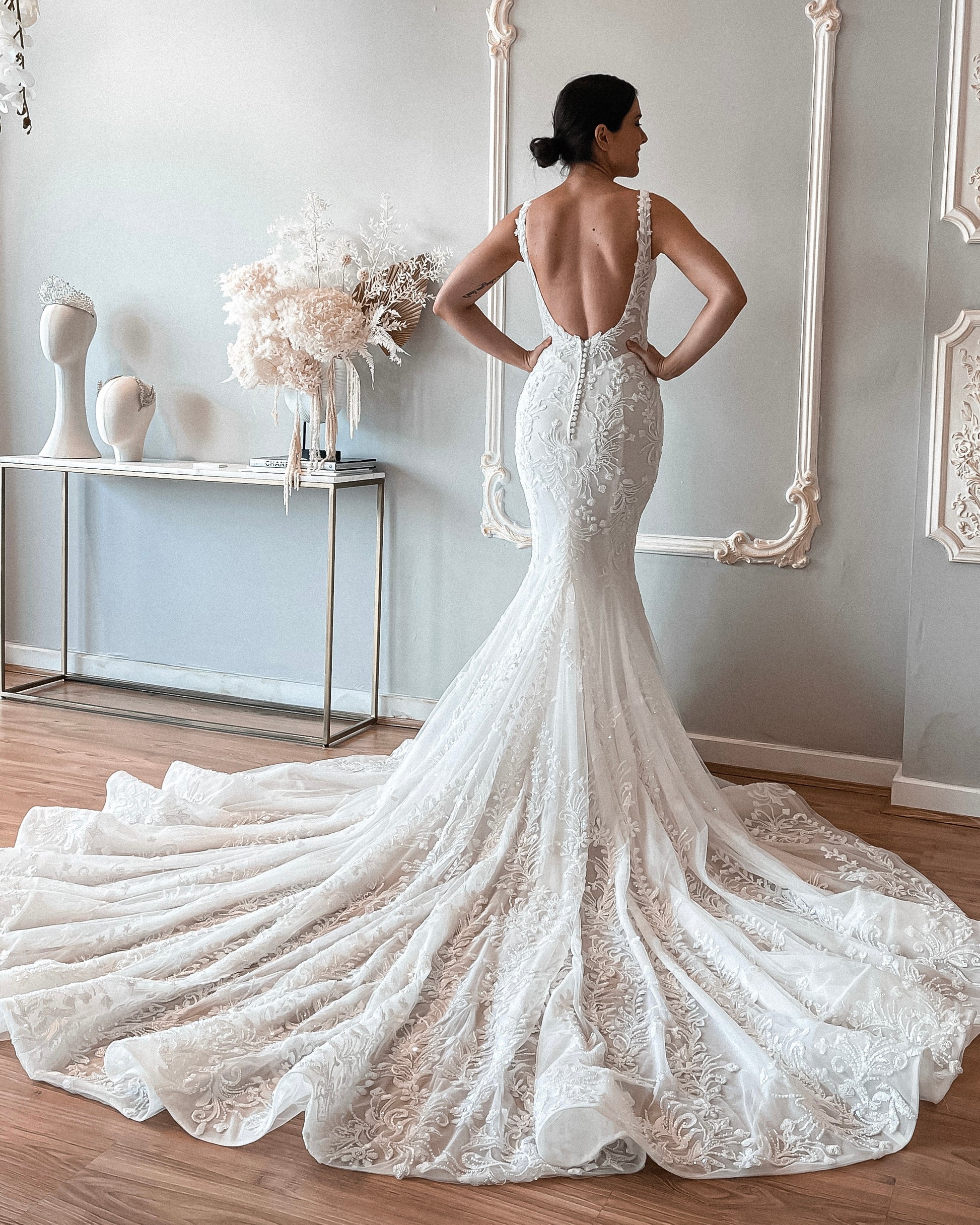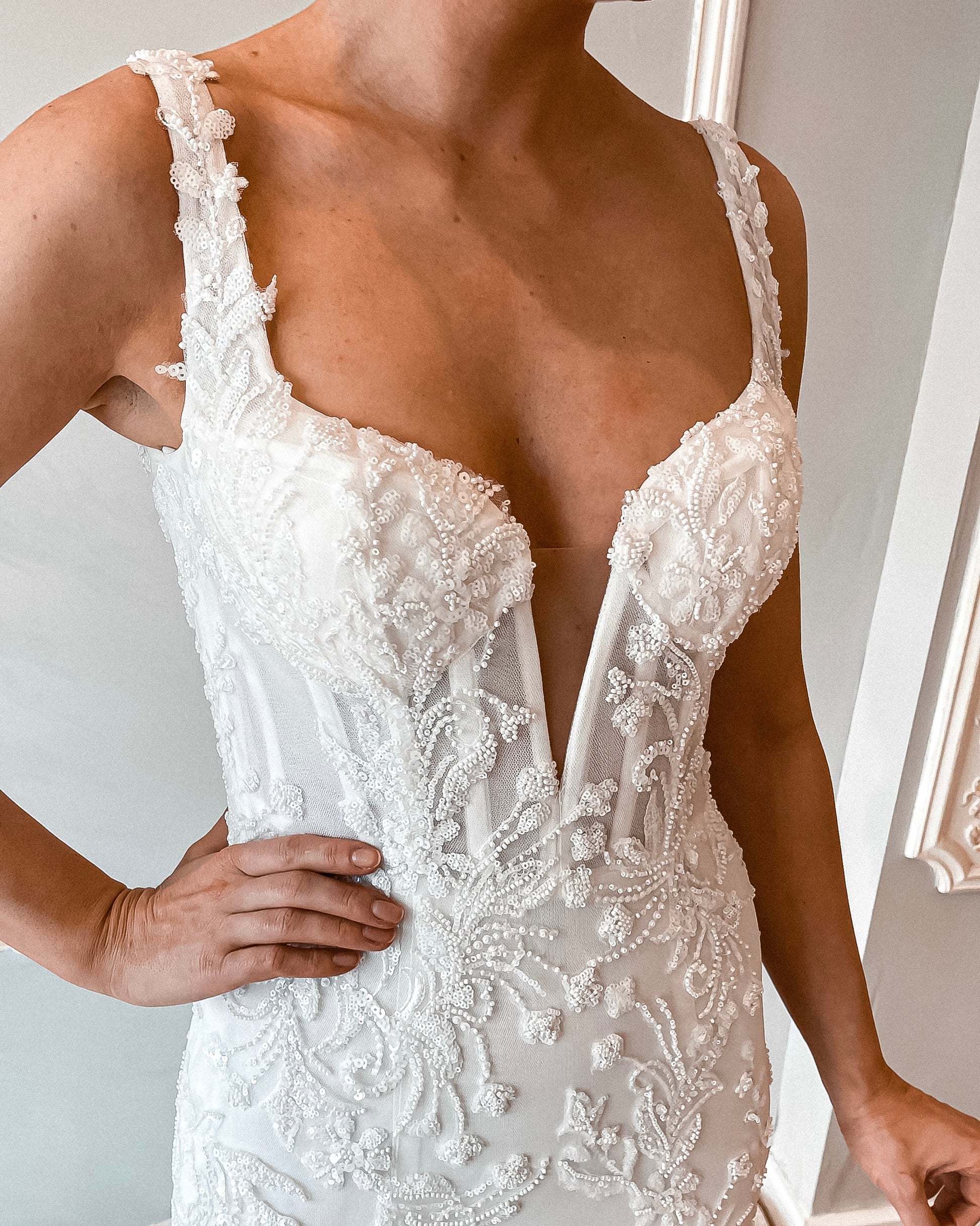 Sample gowns consist of new and pre-existing floor samples, most of which have been tried on but never worn to a wedding. These gowns may require repairs, alterations, and/or dry cleaning, which are not included in the price. Due to their nature, sample gown measurements may vary slightly from the original size grading due to stretching from try-ons. By making a purchase, you acknowledge and accept the condition of the sample gown as described and agree that all sales are final.